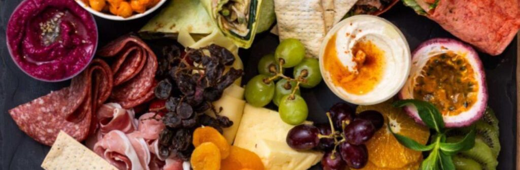 Plant-based (GF) Grazing Box (2) Selection of seasonal crudites & roasted vegetables. Beetroot & spinach falafels. Flavourful dips, marinated olives & pickles. GF roll & crackers. Dried & fresh seasonal fruits & berries. Mixed roasted nuts & chocolate slice.
